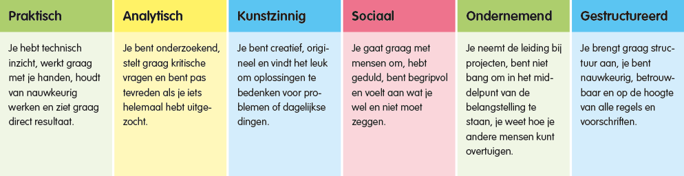 Ben je praktisch, analytisch, kunstzinnig, sociaal, ondernemend of gestructureerd?